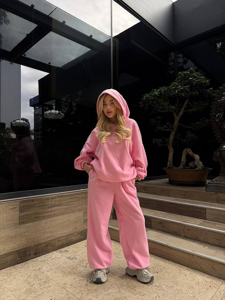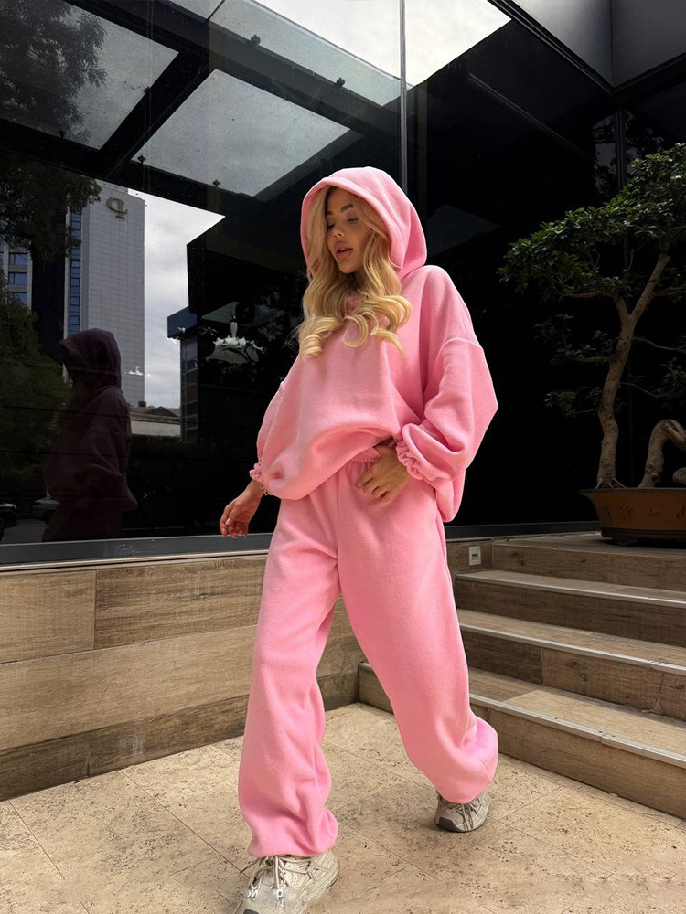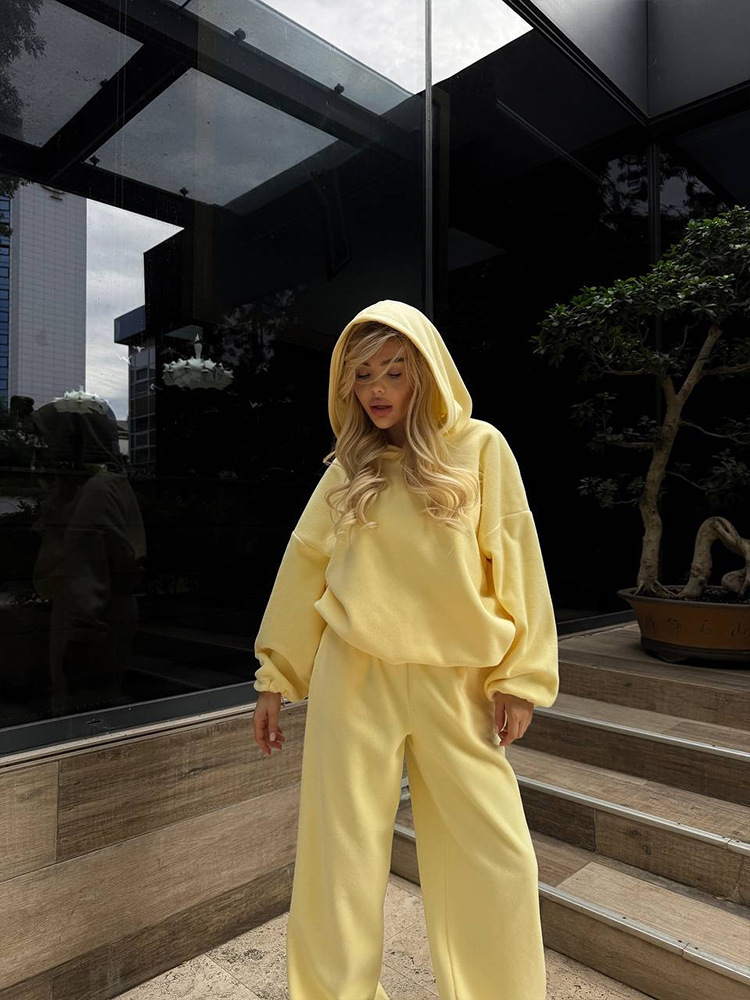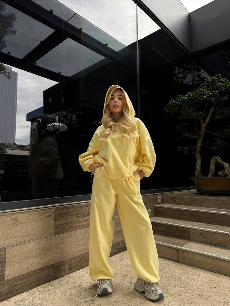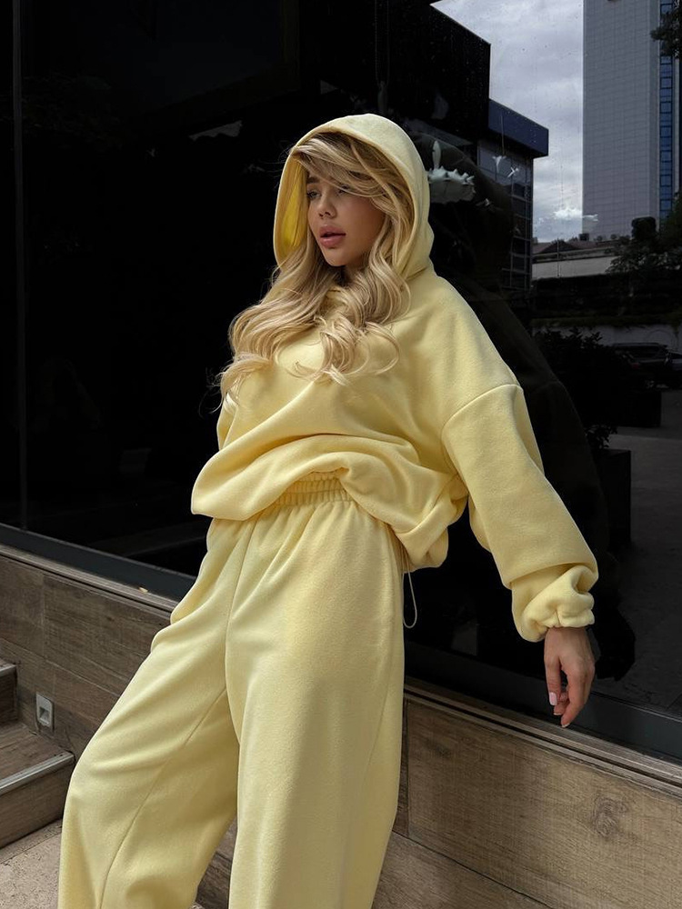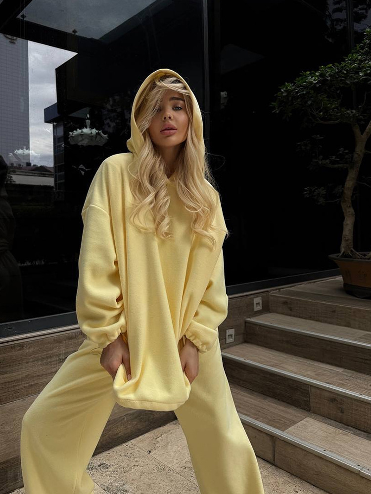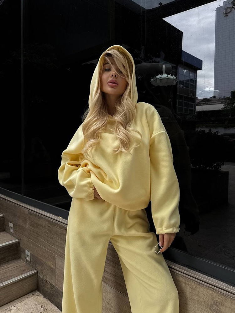 Stay cozy and stylish with this Casual European and American Polar Fleece Women's Suit. Crafted from soft polyester fleece, it features a hooded design and long sleeves for added warmth. Available in yellow, pink, brown, and gray, with trousers in sizes S to XL, this set combines comfort and casual elegance perfect for everyday wear or relaxing weekends.