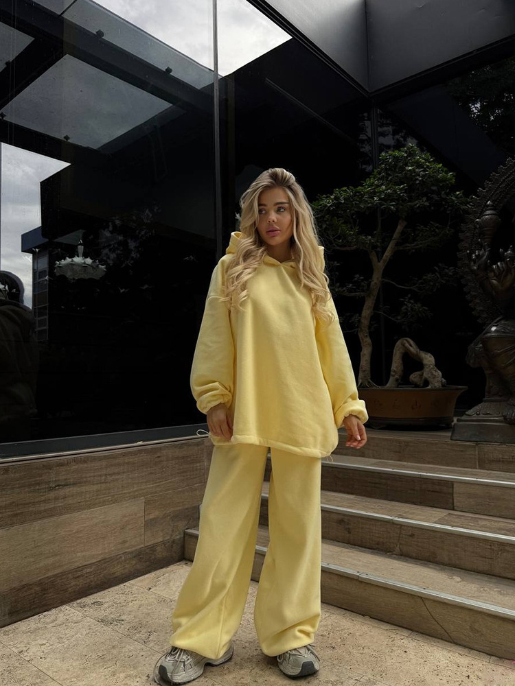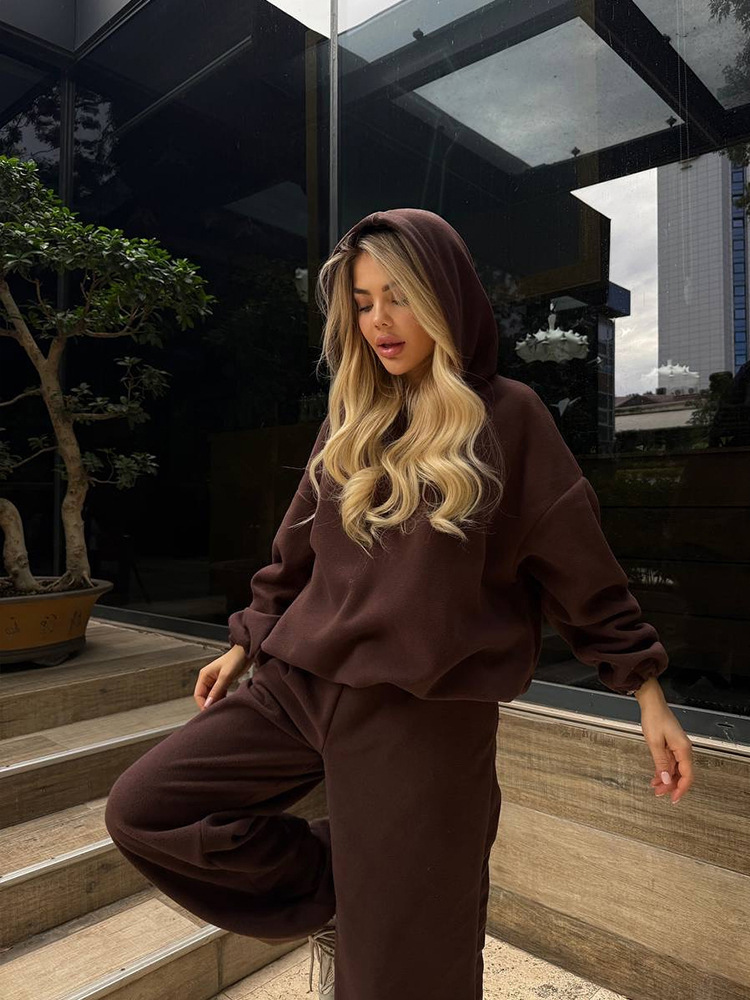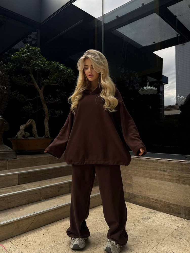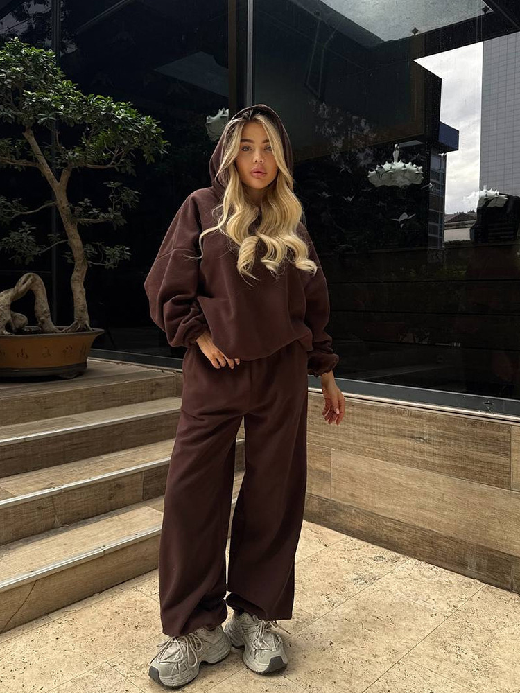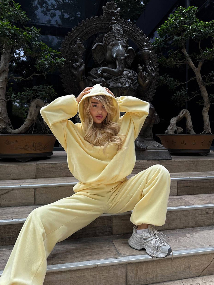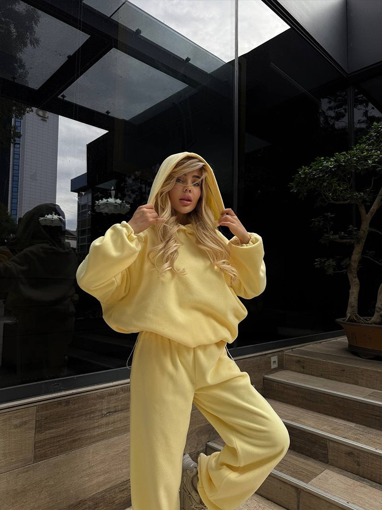 Stay cozy and stylish with this Casual European and American Polar Fleece Women's Suit. Crafted from soft polyester fleece, it features a hooded design and long sleeves for added warmth. Available in yellow, pink, brown, and gray, with trousers in sizes S to XL, this set combines comfort and casual elegance perfect for everyday wear or relaxing weekends.