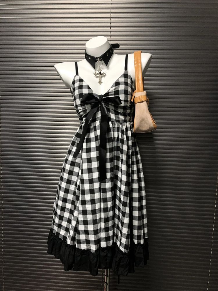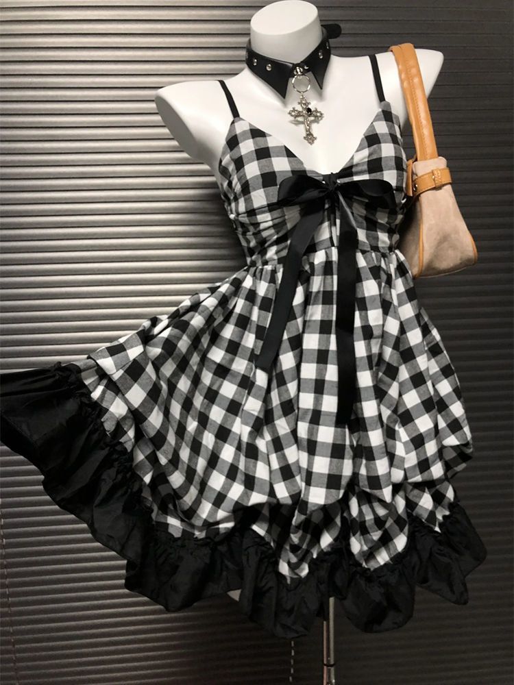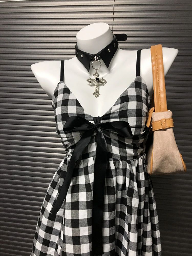 This retro-inspired black and white plaid dress combines a slimming, slim-fit silhouette with a chic A-line skirt for a flattering look. Designed with a low waist and sleeveless sling style, it highlights your figure while offering comfort in soft polyester fabric. The bow detail adds a playful touch, perfect for private socialite occasions. Available in sizes S to XXL, this short skirt dress stands out with its timeless plaid splicing and solid color elements, making it an elegant single-piece choice for your wardrobe.